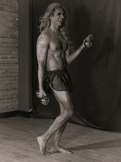 Black and white, vintage-tinged photograph of the artist posing in gym shorts, with weights in each hand. Their eyes are closed and they are laughing.