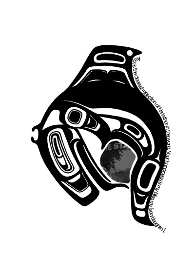 A black-and-white two-dimensional image that is partly abstract, but suggests a bird. In one section of the image, we see a fragment of a black-and-white photograph, with trees in front of a building. Text along its periphery reads "A son is the clearest reflection of his father in the world. Your happiness is my bliss, my [son/daughter]."