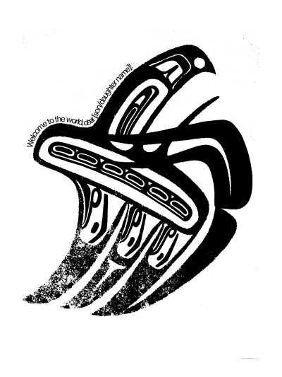 A black-and-white two-dimensional, partly faded image of a bird. Text along its silhouette reads "Welcome to the world, dear [son/daughter] name!