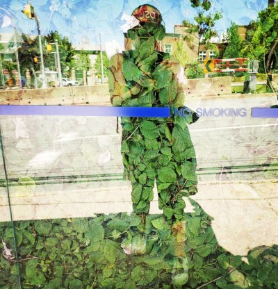 A selfie taken in a the reflective glass of a bus stop, with leaves in the background. In the reflection we see the silhouette of the artist, a road, and a concrete barrier.